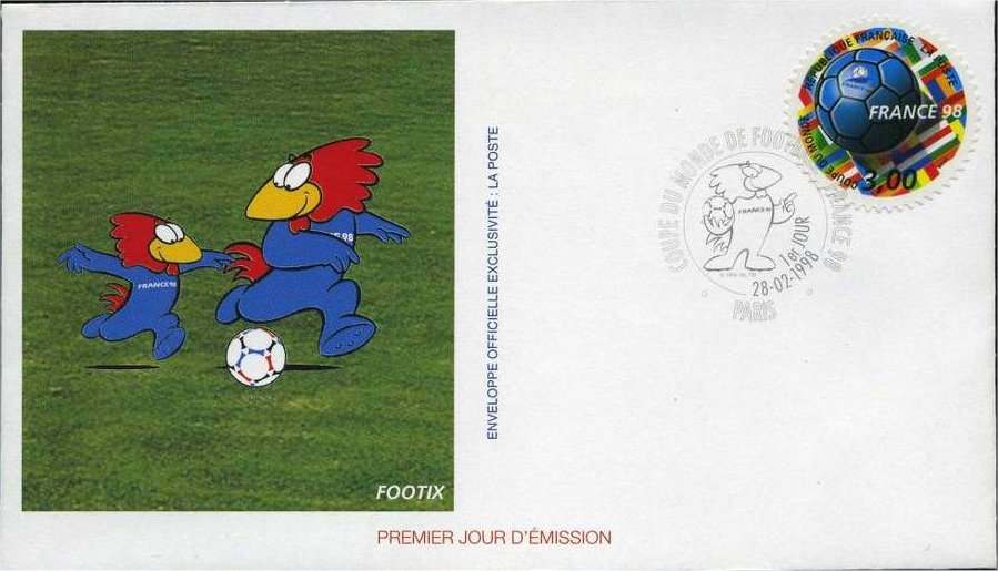 Premier jour d'émission du timbre rond - 28 février 1998 - et illustration avec la mascotte Footix
